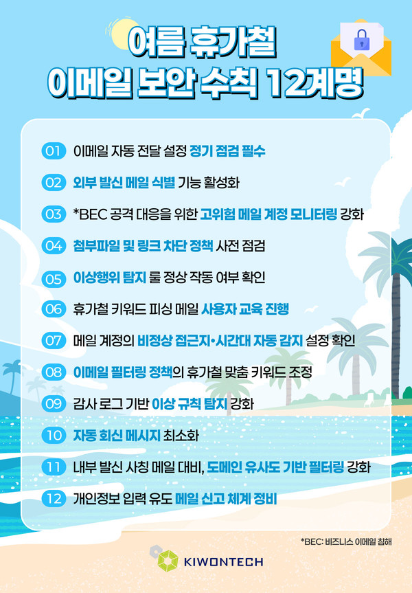 [아이티데일리] 최근 여름 휴가철을 맞아 공격자들이 임직원들의 부재로 보안 관리 체계가 일시적으로 느슨해지는 시기를 노려 정교한 이메일 공격을 시도하는 사례가 급증하고 있다. 이에 국제표준 이메일 보안 전문기업 기원테크(대표 김동철)는 여름 휴가철을 맞아 급증하는 이메일 기반 사이버 공격에 대비한 ‘여름 휴가철 이메일 보안 수칙 12계명’을 1일 공개했다.