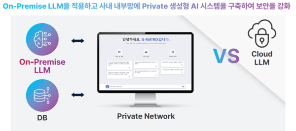 기업 내부 DB와 같은 민감한 데이터를 다루는 경우, 보안에 대한 우려가 큰 것이 현실이다. 지매트릭스(G-MATRIX)는 온프레미스(On-Premise) LLM을 적용하고 사내 내부망에 프라이빗(Private) 생성형 AI 시스템을 구축해 보안에 대한 위험을 줄일 수 있다. 기업의 DB 데이터를 그대로 학습하는 것이 아니라, 메타 정보(테이블명, 컬럼명 등) 등의 최소한의 정보만 학습하기 때문에 학습으로 인한 기업 데이터의 외부 노출 가능성을 줄여준다.