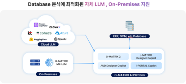 지매트릭스(G-MATRIX)는 대규모언어모델(LLM)을 기반으로 사용자의 자연어 질의 의도를 해석하고 JSON 기반의 의도분류 코드로 변환한 뒤 BI 솔루션에서 제공하는 SQL 자동 생성 기능을 활용해 DB데이터 조회를 위한 쿼리문을 생성한다.