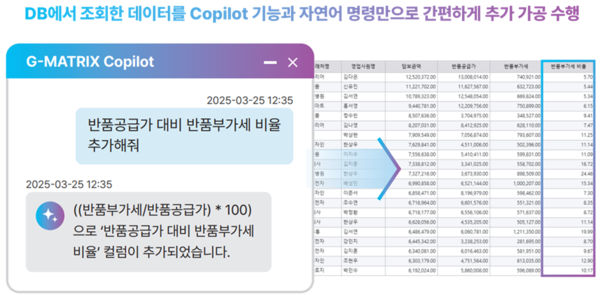 특히 최근 업그레이드된 지매트릭스(G-MATRIX) 3.0은 “사용자의 업무 부담을 얼마나 줄일 수 있는가”를 핵심 과제로 삼고, 이를 해결하기 위해 코파일럿(Copilot) 기능이 탑재됐다. 이 기능은 지매트릭스(G-MATRIX)의 1차 결과 답변에 대해 데이터 가공, 요약, 저장 등 사용자가 추가적인 작업을 쉽게 할 수 있도록 지원해 데이터 활용도를 더욱 높인 것이 특징이다.