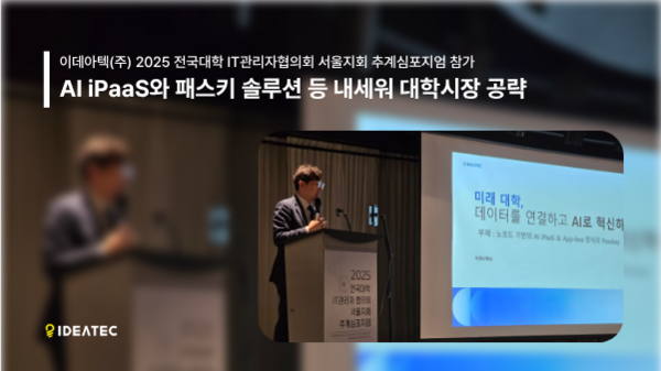 [아이티데일리] AI iPaaS와 노코드 iPaaS 통합연계 플랫폼을 통해 DX를 넘어 AX를 실현하는 이데아텍(대표 이정수, 어윤호)이 지난 9월 25일 강릉 스카이베이 호텔에서 열린 2025 전국대학 IT 관리자협의회 서울지회 추계 심포지엄에서 노코드 AI iPaaS(서비스형 통합 플랫폼)와 패스키 솔루션을 소개하고 실제 대학 구축 사례를 중심으로 활용 사례를 발표했다.
