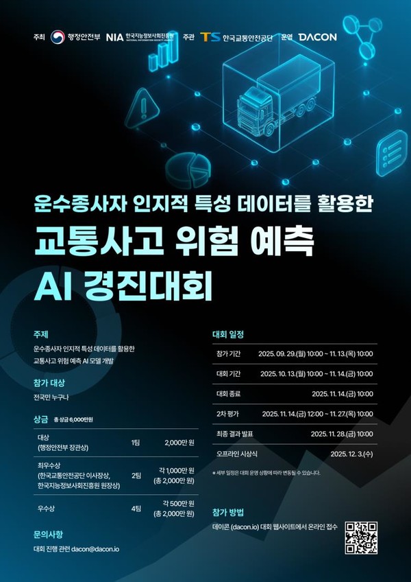 [아이티데일리] 행정안전부와 한국지능정보사회진흥원(NIA)이 추진하는 ‘2025년 정책수립 지원 데이터 분석사업’의 일환으로, 선도소프트가 주관하고 코데이터솔루션, 화이트스캔, 데이콘이 참여하는 컨소시엄이 ‘운수종사자 인지적 특성 데이터를 활용한 교통사고 위험 예측 AI 경진대회’를 지난 10월 13일부터 11월 14일까지 진행한다.
