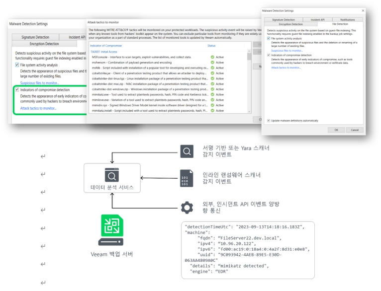 세 번째, AI 엔진을 통한 랜섬웨어 패턴을 분석하도록 구성해야 한다. 백업이 구성되어 있는 가상머신(VM)/물리 서버 내 OS 및 데이터를 AI/ML 기반 콘텐츠 분석을 하여 침해지표(IoC) 감지를 통해 위협 행위자가 사용하는 도구가 존재하는지 그리고 파일시스템 활동분석을 통해 알려진 랜섬웨어 유형이 있는지를 감지하도록 구성해야 한다.