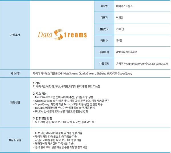 2001년 설립된 데이터스트림즈는 국내 데이터 패브릭 전문기업이다. 데이터 통합·거버넌스·활용을 아우르는 16종의 데이터 제품군을 보유하고 있다. 수집·정제·분석·활용의 전 과정을 하나의 통합 아키텍처에서 구현하는 것이 특징이며, 고품질 데이터 제공을 통해 디지털 전환(DX) 시장을 선도하고 있다.
