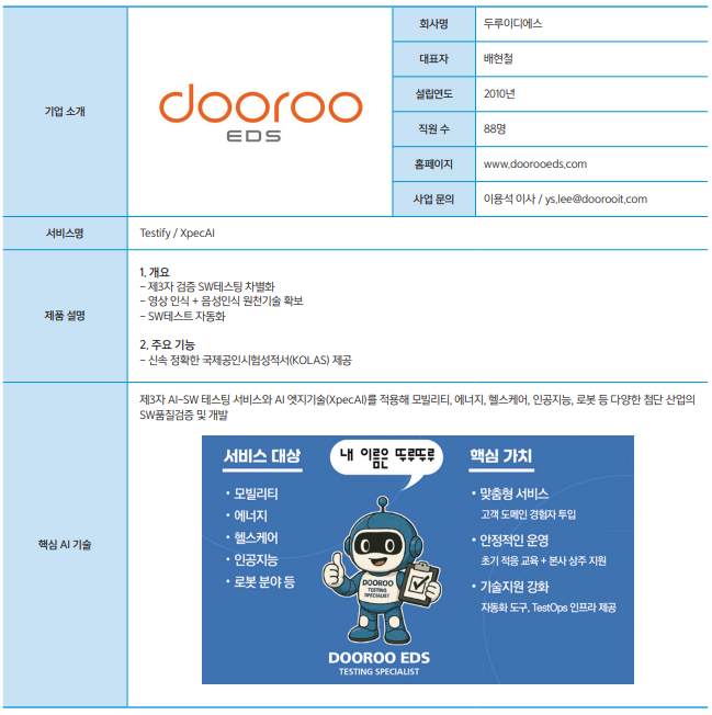 두루이디에스는 2010년에 설립돼 소프트웨어(SW) 품질 관리 분야에서 깊은 전문성을 쌓아온 전문 기업이다. 특히 주목할 점은 국제공인시험기관(KOLAS)으로부터 ‘제 3자 AI-SW 테스팅 서비스’를 인정받았다는 사실이다. 이는 두루이디에스가 객관적이고 신뢰도 높은 기준으로 AI 관련 소프트웨어의 품질을 검증할 수 있는 역량을 갖추고 있음을 보여준다.