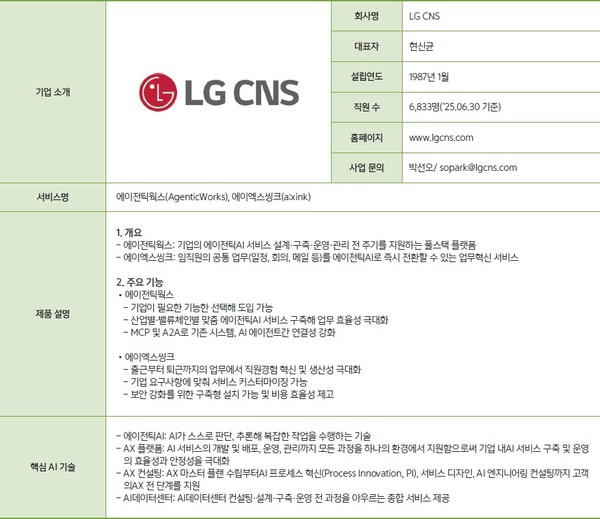 1987년 설립된 LG CNS는 국내 IT서비스를 대표하는 기업이다. 시스템 통합(SI)과 클라우드, AI·데이터 기반 DX 서비스를 주력으로 비즈니스를 영위하고 있다. ‘AX(애널리틱스(Analytics)/인공지능(AI)/자동화 경험(Automation Experience))’를 중심에 둔 기술·업무 역량 고도화를 통해 고객의 비즈니스 가치 창출을 지원하고 있다. 최근에는 로봇 전환(RX)와 글로벌 클라우드 인프라 사업까지 영역을 확장하고 있다.