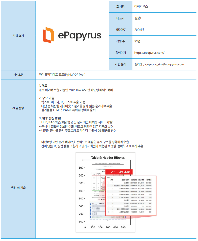 이파피루스는 20년간 축적해 온 PDF 기술력과 최신 AI 기반 문서 분석 기술을 결합해 기업의 문서 데이터 활용 효율을 극대화하는 다양한 솔루션을 제공하고 있다. AI는 문서 중심 산업의 핵심 인프라로, 수많은 문서 속에 기업 의사결정에 필요한 핵심 정보가 숨어 있다. 하지만 대부분의 조직은 이러한 데이터를 충분히 활용하지 못하고 있다는 점을 해결하기 위해 이파피루스는 AI를 활용하고 있다.
