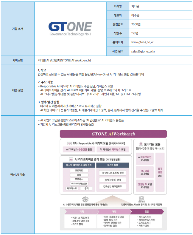특히 지티원은 금융 컴플라이언스 중심의 신뢰성 있는 AI 실현을 위한 AI 거버넌스 솔루션을 고객에게 공급하고 있다. 이는 규제와 신뢰성이 중요한 금융 환경에서 AI 도입 시 발생할 수 있는 잠재적 위험을 관리하고, 고객이 지속 가능한 혁신을 이어갈 수 있도록 돕는 데 중요한 역할을 한다. 결과적으로 지티원은 AI 거버넌스 플랫폼을 통해 AI 시대의 안정적인 비즈니스 환경을 제공하는 필수 파트너로 자리매김하고 있다.