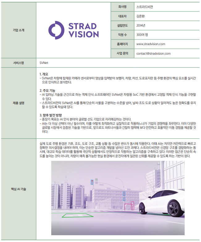 2014년 설립된 스트라드비젼(STRADVISION, 대표 김준환)은 AI 기반 영상 인식 소프트웨어 전문 기업으로, 자율주행과 첨단 운전자 보조 시스템(ADAS)에 최적화된 솔루션을 제공하고 있다. “보다 안전하고 지능적인 모빌리티 세상 구현”을 비전으로 삼은 스트라드비젼은 독자적인 딥러닝 기반 인식 기술을 통해 글로벌 완성차 업체와 협력하며 시장을 확장해왔다.