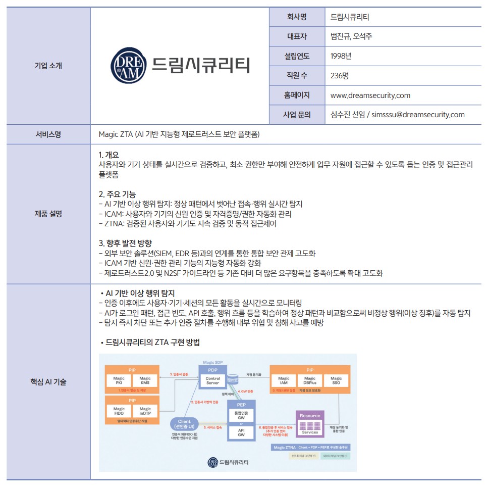회사는 AI 기반 이상 행위 탐지 및 위협 분석으로 Magic ZTA를 고도화하고 있다. AI는 로그인 패턴, 접속 위치, API 호출 이력 등 다양한 행위 데이터를 실시간 분석해 비정상 로그인이나 내부자 공격 등의 잠재 위협을 조기에 식별한다. AI 기반 동적 정책 적용 기능으로 사용자 상태에 따라 접근 정책을 자동으로 조정함으로써 지속적인 검증 환경을 구현할 수 있다.