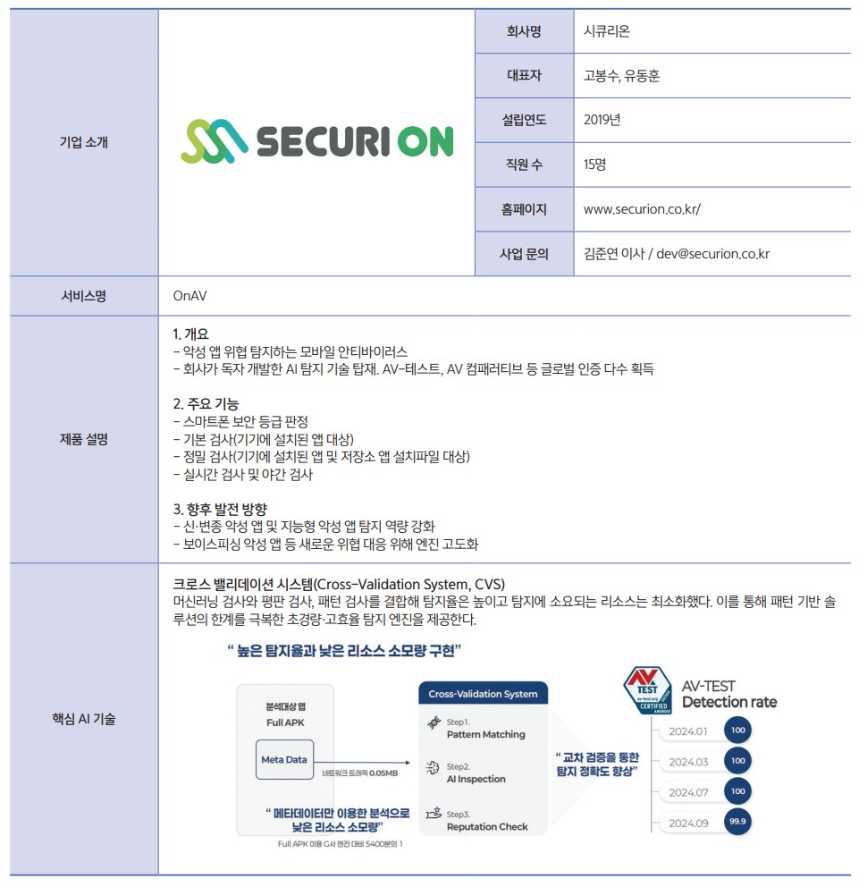 회사의 경쟁력은 AI 탐지 및 분석 기술이다. 시큐리온은 지난 2018부터 OnAV에 ‘크로스 밸리데이션 시스템(Cross-Validation System, CVS)’을 탑재했다. CVS는 AI 기반 악성 앱 탐지 시스템으로, 머신러닝 검사와 평판 검사, 패턴 검사를 결합해 탐지율은 높이고 리소스는 최소화한다. 회사는 고유 패턴(시그니처, Signature)을 바탕으로 악성코드를 감지하는 기존 방식의 한계를 극복하기 위해 CVS를 개발했다.