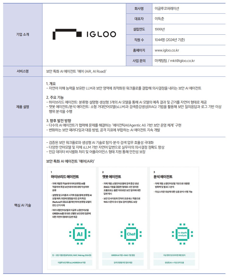 이글루코퍼레이션의 AI 보안 기술은 실제 구축 사례를 통해 그 효율성을 입증해 왔다. 2018년 ‘대구 AI 기반 지능형 보안관제 체계(D-Security)’를 구축하며 AI 보안 운영의 효율성을 구체적으로 증명한 바 있다. 2019년에는 AI 보안관제 솔루션을 발 빠르게 시장에 선보였다. 2023년 LLM을 적용한 AI 보안 어시스턴트 ‘에어(AiR)’를 출시했으며, 2025년 7월 이를 ‘AI 에이전트’ 형태로 한 단계 발전시켰다.