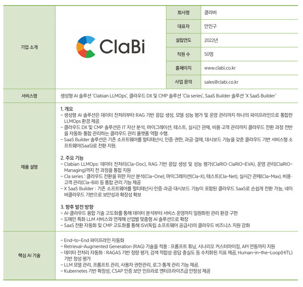 클라비는 AI를 모델 개발보다 운영, 평가, 모니터링 체계를 중시하는 ‘고객 업무 효율을 개선하는 실행 도구’로 보고 있다. 더불어 클라우드 DX 및 CMP 솔루션을 통해 고객의 클라우드 전환을 돕고 있다. 이를 위해 클라우드 전환을 위한 자동화 도구(Cla-One, Cla-X, Cla-Net)와 실시간 관제 및 비용 관리 솔루션(Cla-Max, Cla-Bill) 등이 활용된다.