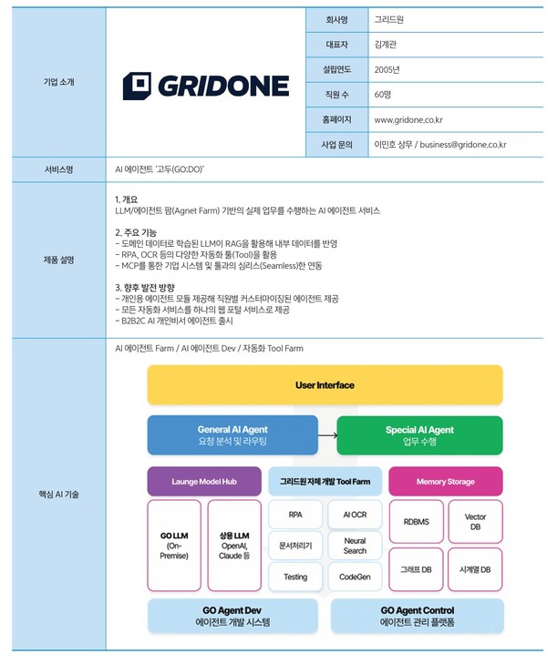 그리드원은 초거대 AI 개발 경쟁이 국가 단위의 영역으로 넘어간 가운데, ‘좋은 AI를 활용한 실무형 서비스’에 집중한다는 전략이다. LLM·RAG·RPA·OCR을 융합한 ‘고두(GO;DO)’는 도메인 데이터 학습을 통해 기업 내부 시스템과 연동되며, 명령 한 줄로 문서 작성·데이터 처리·업무 실행이 가능한 AI 에이전트 서비스를 구현한다. ‘GO(명령을 내리고) ; DO(행동한다)’라는 이름처럼, 사람의 의도를 이해하고 실질적인 행동으로 이어지는 지능형 비서의 형태를 지향한다.