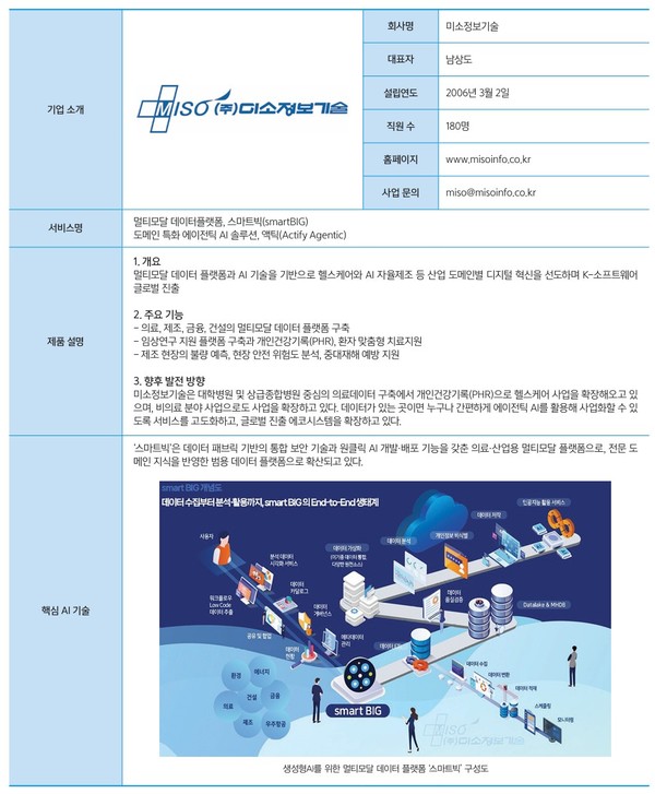 미소정보기술(Miso InfoTech, 대표 남상도)은 멀티모달 데이터 플랫폼과 인공지능(AI)을 기반으로 의료와 제조 현장의 디지털 혁신을 선도하는 기업이다. 국제 표준(FHIR)에 기반한 데이터 정합성과 보안성을 확보해 환자 중심의 스마트 의료 환경을 구축하고, 빅데이터와 인공지능을 활용한 맞춤형 진료 지원으로 의료기관의 효율성과 환자의 삶의 질을 동시에 높이고 있다.