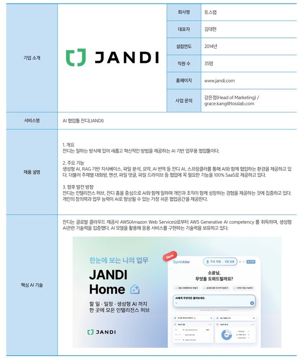 2014년 설립된 토스랩(Toss Lab, 대표 김대현)은 언제 어디서나 효율적으로 일할 수 있도록 돕는 업무용 AI 협업툴 ‘잔디(JANDI)’를 서비스하는 글로벌 IT 스타트업이다. 한국 본사를 중심으로 대만, 일본 등 약 70여 개국 40만 팀 이상이 잔디를 사용하고 있으며, ISO 27001 정보보호 인증과 CSA STAR 클라우드 보안 인증을 획득해 서비스 안정성과 보안 기술력을 인정받았다. 잔디는 2017년 유료 버전 출시 이후 한샘, 롯데백화점, 넥센타이어, 온누리약국, 파고다 등 국내외 40만 개 이상의 기업 및 팀에서 업무 혁신의 도구로 자리 잡고 있다.
