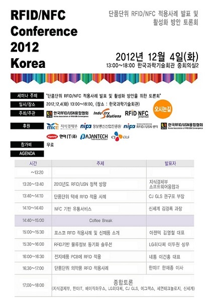 이번 행사는 올해 국내 RFID/NFC 시장을 정리하는 자리로, 내년도 정부의 RFID 정책, 다양한 RFID/NFC 적용사례를 비롯, 향후 단품단위 RFID/NFC 활성화 방안 토론 등 다채로운 주제발표 및 토론이 진행될 예정이다.