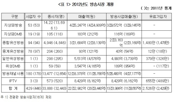 [아이티데일리] 지난해(2012) 방송사업 총 매출은 13조 1984억원으로 전년도인 2011년 보다 11.3% 증가한 것으로 나타났다.