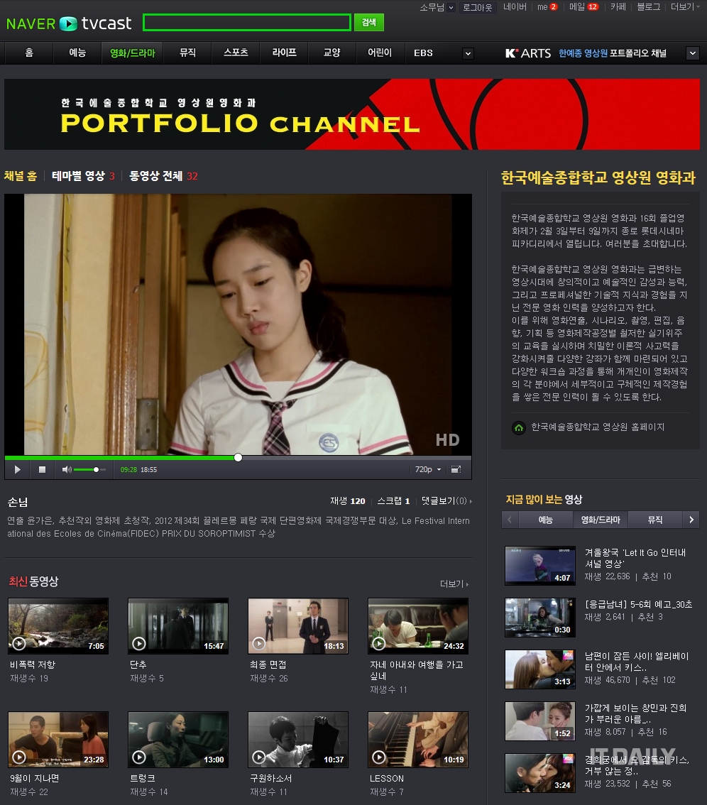 [아이티데일리] 네이버(대표 김상헌)는 네이버TV캐스트 내 한국예술종합학교 영상원(원장 편장완, 이하 한예종 영상원) 채널을 신설, 한예종 영상원의 졸업영화를 공개한다고 4일 밝혔다.