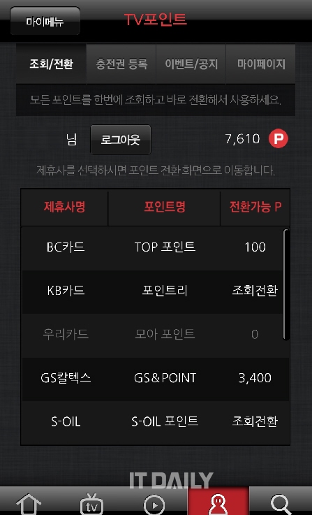 우선 ‘올레tv모바일’ 앱을 최신 버전으로 업데이트한 후, ‘마이메뉴’ 내 ‘TV포인트’ 메뉴에 들어가면 TV포인트 회원 가입이 가능하다. ‘조회/전환’ 메뉴에서 제휴포인트를 TV포인트로 바꾸면 된다. 이후 ‘올레tv모바일’에서 유료 VOD 구매 시 콘텐츠 금액 전액을 포인트로 결제할 수 있다.
