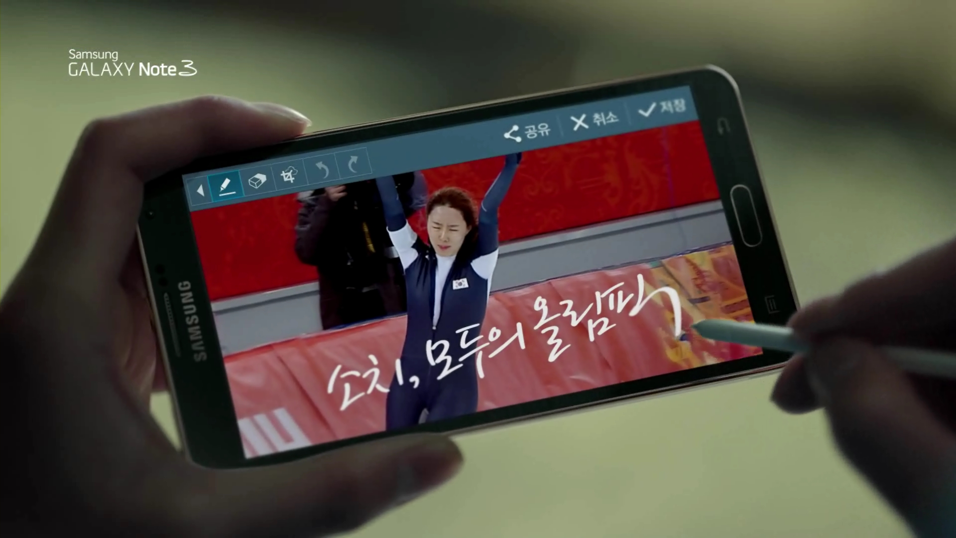 온라인에서 먼저 방영된 이 광고에는 이상화 선수의 실제 경기 기록 ‘37초 28 올림픽 신기록’과 갤럭시 응원단이 ‘대한민국 첫 금메달’, ‘이상화 올림픽 2연패’가 쓰여진 응원보드를 들고 환호하는 모습이 담겼다.