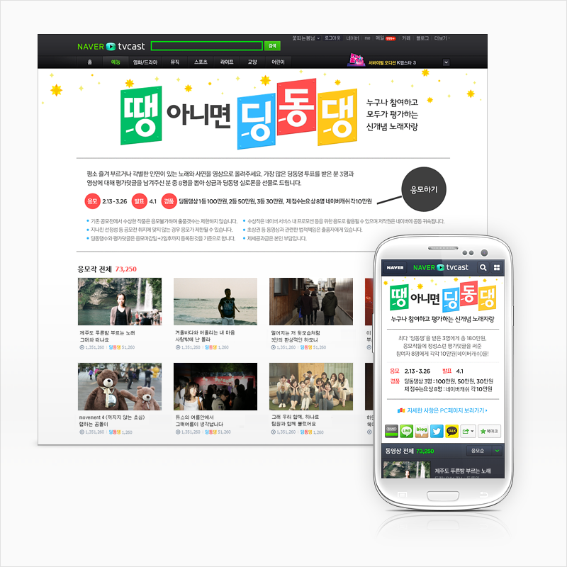 [아이티데일리] 네이버는 자사의 동영상 서비스 TV캐스트에 누구나 쉽게 참가 및 심사하는 온라인 노래자랑 ‘땡 아니면 딩동댕’을 오는 3월 26일까지 개최한다고 발표했다.