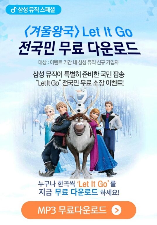 소리바다는 삼성뮤직의 ‘국민팝송 Let It Go 전국민 무료 다운로드’가 삼성뮤직 신규 가입자 대상으로 디즈니 영화 ‘겨울왕국’의 대표곡 ‘Let It Go’ 무료 다운로드를 제공하는 이벤트라고 설명했다.