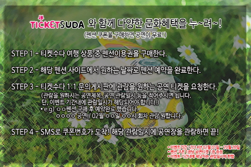 이벤트 참여는 티켓수다에서 펜션 이용권을 구매한 후 원하는 일정으로 펜션 예약을 완료한 다음,티켓수다 1:1 문의게시판에 원하는 공연제목, 공연관람 일시 등을 적으면 응모가 완료된다. 티켓 예매권은 SMS로 즉시 발송된다.