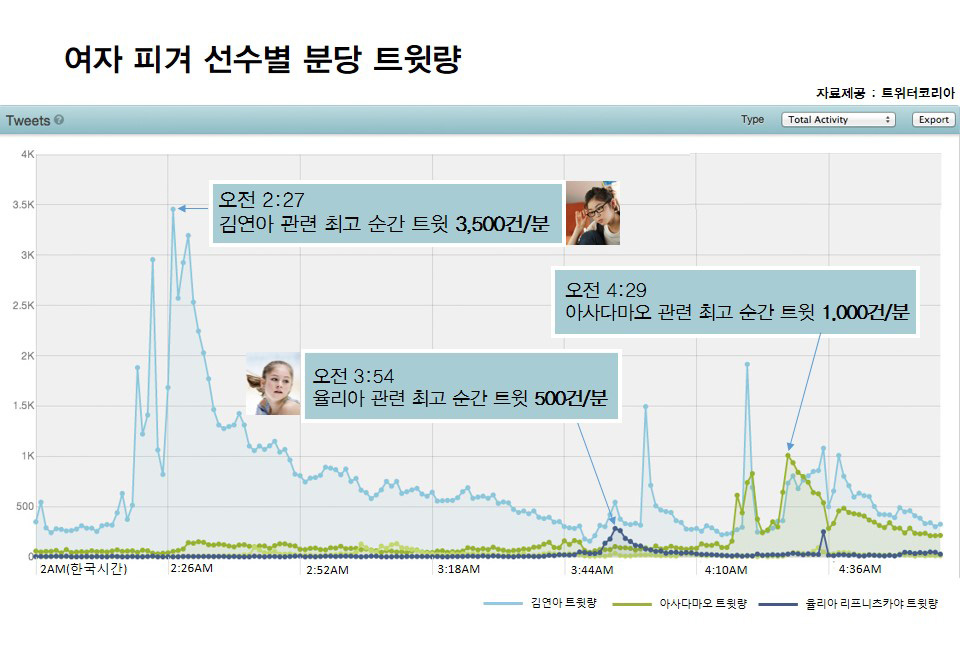 트위터코리아는 김연아 선수가 피겨스케이팅 여자 싱글 쇼트프로그램에서 러시아의 아델리나 소트니코바 선수를 제치고 1위를 차지하자 나온 이 기록이 소치 동계올림픽 기간 동안 1분 간 ‘순간 트윗량’ 중 최고치라고 설명했다.