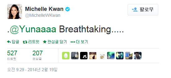 특히, 미국 피겨스타 미쉘콴은 김연아 선수 경기 후 자신의 트위터에 “숨이 멎을 듯하다(Breathtaking)”라고 남겼고, 일본 피겨선수 안도미키도 “연아 와우! 너무 멋지기에 거의 울 뻔했다. 정말 그녀는 훌륭한 스케이터다”라고 극찬했다.