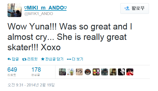 한편, 일본의 아사다 마오 선수의 경기 후에는 약 1천 건의 관련 트윗이 올라왔으며, 러시아의 율리아 리프니츠카야 선수의 경기 후에는 약 500건의 관련 트윗이 작성됐다고 덧붙였다.