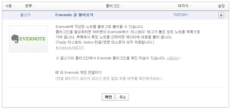 다음은 ‘티스토리’에 해당 플러그인을 설정하고, 사용 중인 에버노트 계정과 연결하면 ‘에버노트 글 불러오기’를 사용할 수 있다고 설명했다. 에버노트로 작성한 글에 ‘티스토리’라는 태그를 달면 티스토리로 불러올 수 있으며, 태그는 한글과 영문(대소문자 포함) 모두 가능하다.