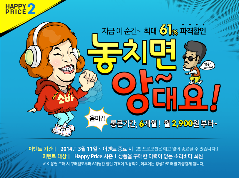 한편, 소리바다는 ‘놓치면 앙~대요’ 이벤트를 통해 구매 시 6개월 간 할인가를 적용하며, 이후 정상가로 자동 결제된다고 덧붙였다.