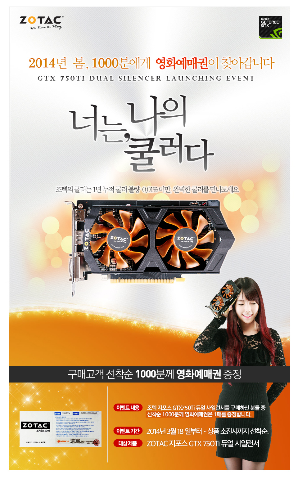 이번 이벤트에 참가하려면 컴퓨터 용품 쇼핑몰인 아이티엔조이, 컴퓨존, 이지가이드, 아이코다, 컴퓨터코리아 등 온라인 쇼핑몰에서 지포스 GTX 750 Ti 듀얼사일런서 그래픽카드 제품을 구매하면 되며 영화표 1000장 소진 시 조기 종료된다.