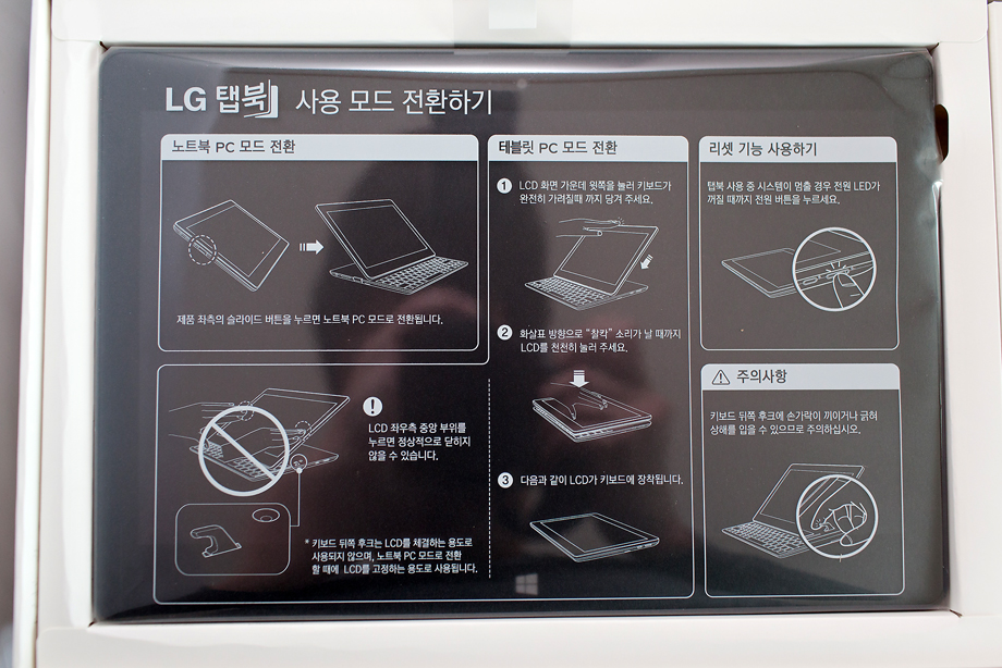 박스를 개봉하니 탭북를 보호하고 있는 필름에 탭북의 간단한 사용방법이 적혀 있는 것이 보입니다. 평소에는 태블릿PC로 쓰다가 좌측의 슬라이드 버튼을 누르면 노트북PC로 전환된다는 것을 제일 먼저 설명하고 있네요. 노트북모드로 쓰다가 다시 태블릿PC모드로 쓰고 싶으면 간단하게 LCD를 눌러주시면 된다는 설명입니다.