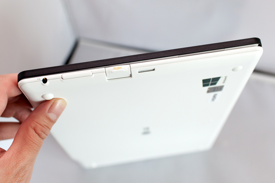후면은 태블릿PC보다는 조금은 노트북스러운 후면을 보여 줍니다. LG 2014년형 탭북이 HDMI와 인텔프로세서 그리고 윈도우가 탑재 되었다는 것을 나타내주는 마크도 있습니다.