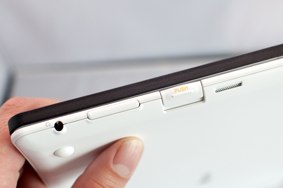 좌측에는 3.5파이 오디오단자와 볼룸버튼 그리고 노트북모드로 바꿔주는 슬라이드버튼이 위치하고 있습니다. 역시 스피커가 위치해 있는 것을 볼 수 있네요.