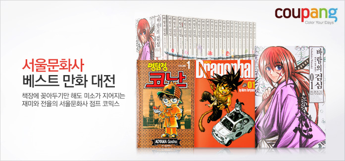 쿠팡은 이번 ‘만화대전’을 국내 대표 만화 출판사인 서울문화사의 인기 작품들로 구성, 액션·추리·로맨스 등 다양한 장르를 최대 40% 할인가에 선보인다고 밝혔다. 1억 5천만 부 누적판매량을 기록하고 있는 스테디셀러 만화 ‘드래곤볼(34권)’과 5천만 부 이상의 판매량을 기록한 ‘바람의 검심(22권)’을 각각 40% 할인된 14만2800원, 11만400원에 판매한다. ‘명탐정 코난’, ‘소년탐정 김전일’ 등 인기 추리물을 비롯해 일본 인기작가 ‘우라사와 나오키’의 ‘몬스터’·‘플루토’ 등의 작품도 30~40% 할인가에 선보인다.
