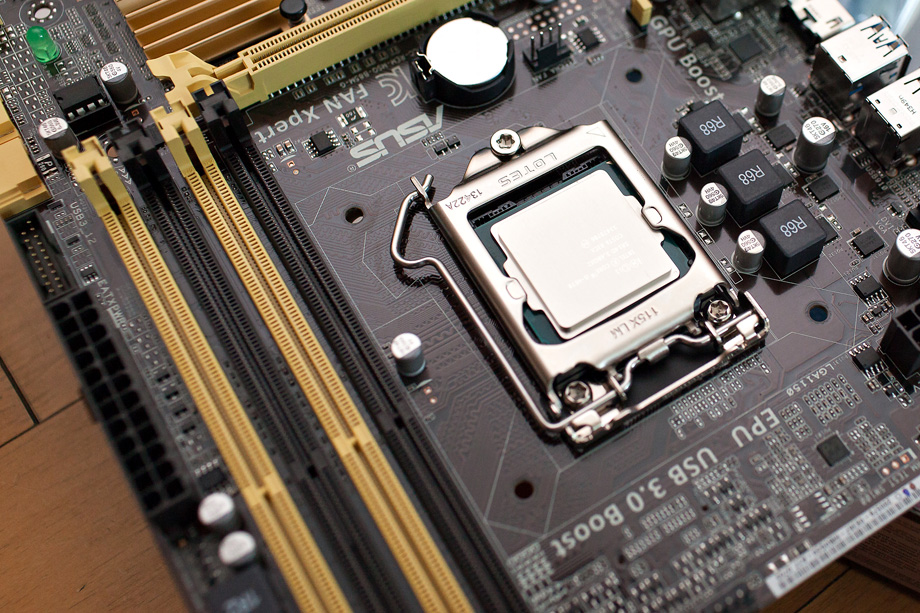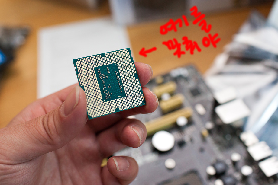 늘 말씀 드리지만 요즘 PC 조립법은 웬만한 프라모델 조립하는 것 보다 더 쉽습니다. 컴퓨터 조립하는 것 보다 건담 MG 하나 조립하는게 더 오래 걸리더군요. 그림에 표시된 부분을 CPU에 들어갈 자리에 맞춰서 넣어주시면 됩니다.
