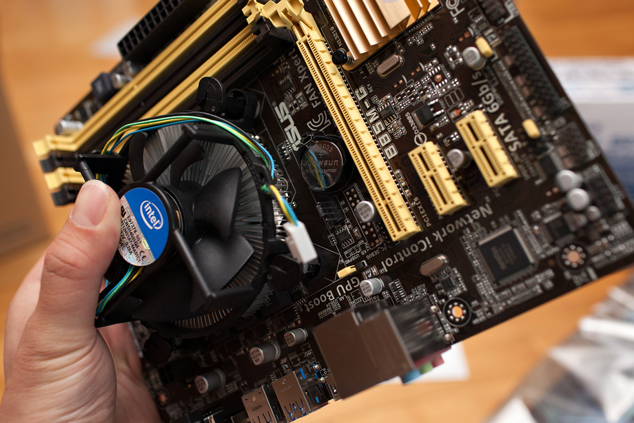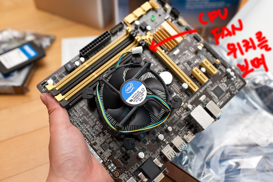 이후에 CPU FAN을 달아줍니다. CPU FAN은 보드에 CPU FAN이라고 써 있는 곳에 전원을 넣어 줘야 하기 때문에 미리 자리를 보시고 방향을 정해서 넣으시면 됩니다. 사실 어떤 방향으로 넣어도 상관이 없긴 합니다만 CPU FAN 전원선이 너무 길게 늘어져 있으면 CPU FAN에 걸리는 경우가 있어서 말이죠.