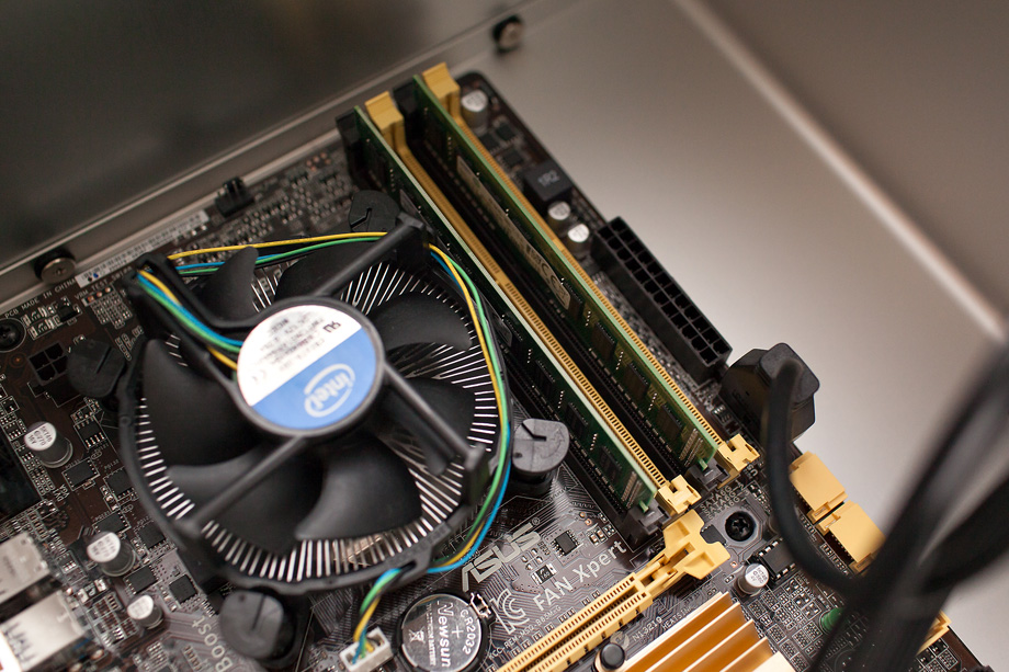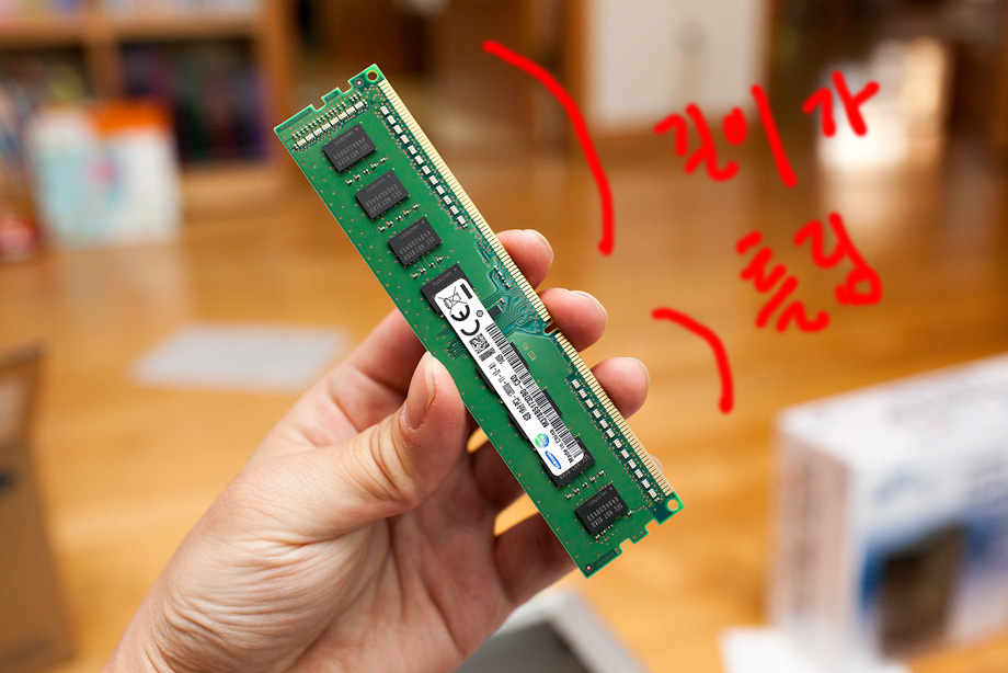 앗 선을 연결하기 전에 메모리 부터 넣었어야 하는데... 뭐 별로 순서 상관은 없으니까요. DDR RAM의 경우 한쪽이 길고 한쪽이 짧기 때문에 천하장사가 아니면 꺼꾸로 끼기도 힘듭니다.