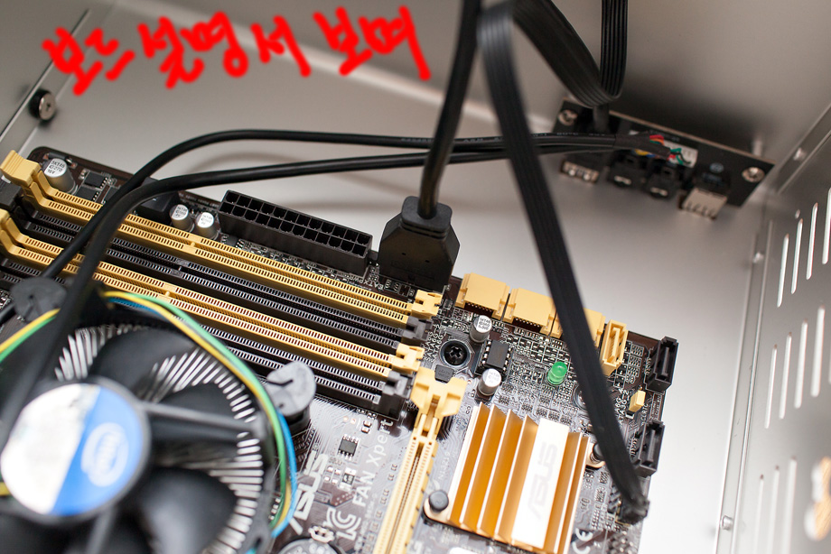 파워를 꼽는 것은 어려운 것이 없다 생각 됩니다. 특히나 이번 조립에서는 그래픽카드가 빠져서 말이죠. 파워 꼽는것에서 가장 중요한 것중 하나는 이 4핀 전원선을 보드에 꼽는일 이빈다. 이것만 잘 하시면 별 문제 없이 조립이 완료가 됩니다.