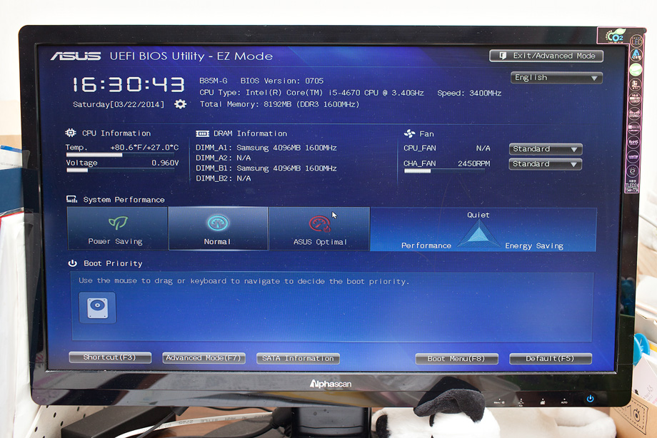 오늘은 별 이상없이 들어오네요. CMOS 까지 이렇게 그래픽 UI가 되어 있다니 참 편한 세상입니다. 별 에러 없이 다 인식이 되는 것을 볼 수 있네요. 예전에는 여기 까지 하면 컴퓨터 조립을 1/4정도 한 것이라 할 수 있었습니다. CD로 윈도우를 HDD에 까는 시간이 엄청나게 걸렸기 때문이죠.