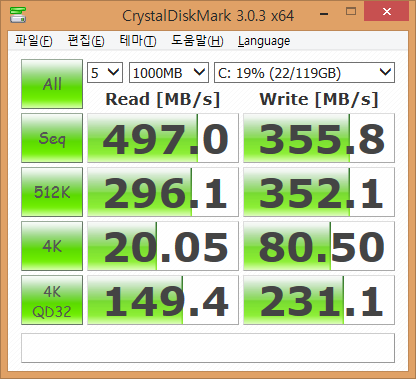 크리스탈벤치를 돌려 보니 속도는 잘 나오는 편 이네요. 측정한 필립스 SSD에 대한 포스팅은 다음 링크에서 보실 수 있습니다. ( http://feena74.blog.me/140209110545 )