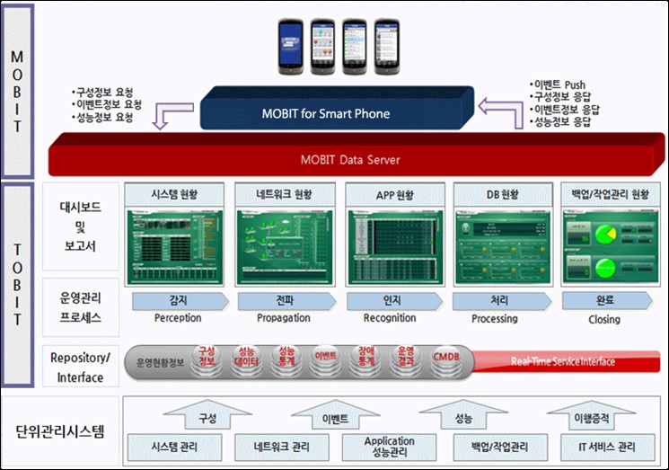모빗(MOBIT)은 이런 시대의 흐름에 맞춰 개발된 제품으로 관제 담당자가 언제 어디서나 실시간으로 기업의 ICT 장비에 대한 통합관제/관리를 할 수 있도록 해준다. ICT 통합관제는 독립적이고 전문화된 정보를 통합해 사용자 및 비즈니스 관점의 직관적인 정보로 재해석해 고객에게 제공하는 시스템이다.