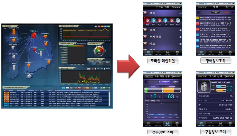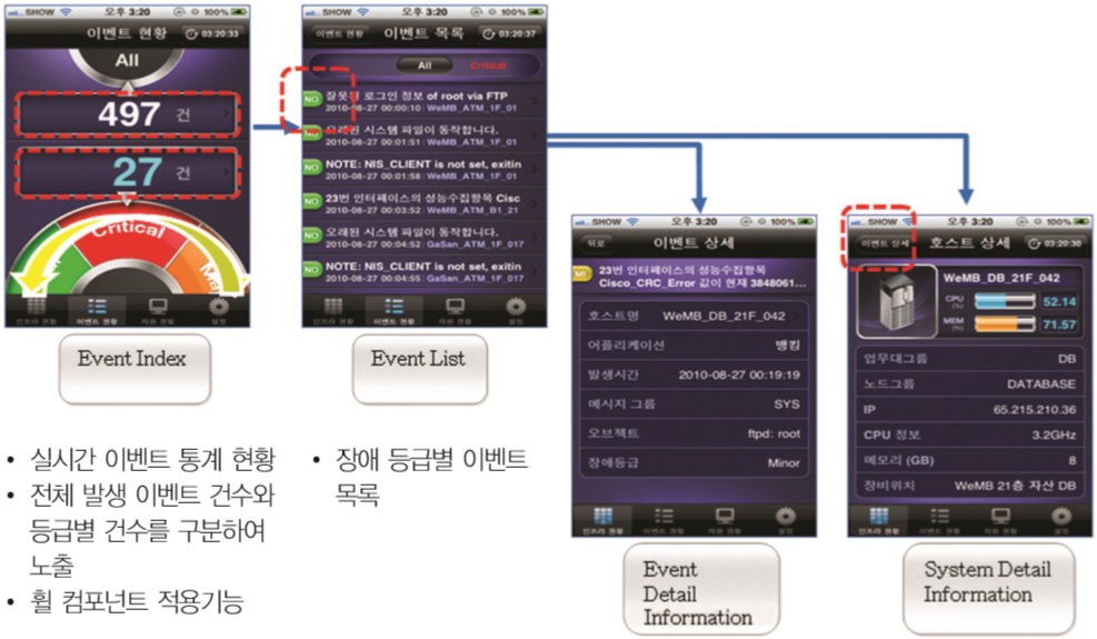 시스템관리, 네트워크관리, 데이터베이스관리, 어플리케이션관리, 서비스관리, 자산관리 등 각종 관리 솔루션과 연동해 각각의 모바일 디바이스에서 장애 및 성능정보를 연동한다.