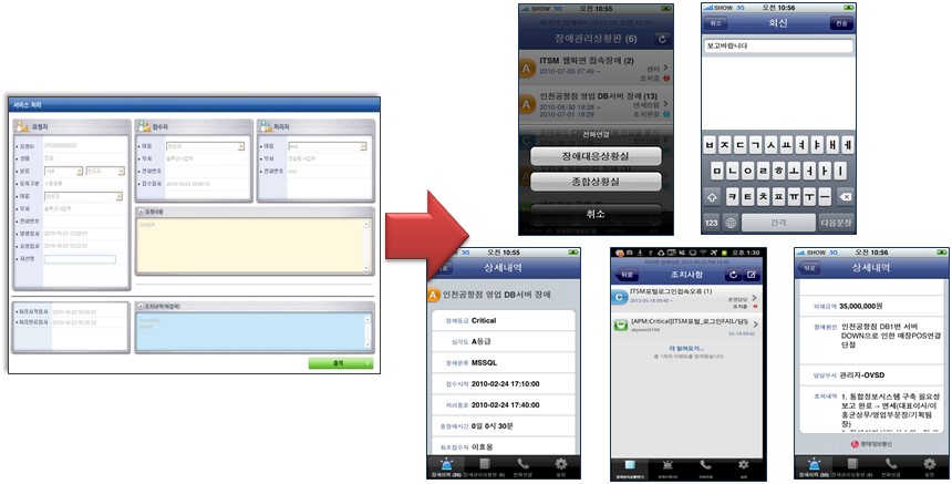 기업 내 그룹웨어와 연동해 각종 업무처리를 모바일로 전환할 수 있으며, 장애 이력에 대한 상세내역 조회도 가능하다.