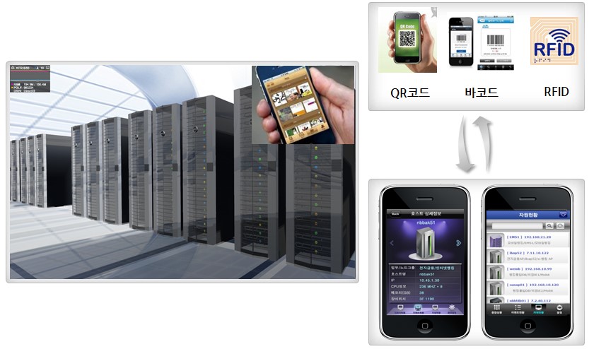 현재 운영하고 있거나 또는 추가 구축 계획이 있는 자산관리(ITAM) 솔루션 및 QR코드, 바코드 RFID 등과 연동해 자산관리가 가능하다. 자산관리 플랫폼을 이용해 모바일 디바이스로 자산정보의 수정 및 추가 입력 작업을 할 수 있으며, 3D 상면도 등과 연동해 실질적인 상면 구성관리도 가능하다.