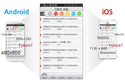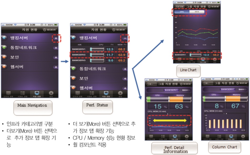 모바일 통합 대시보드 기능을 통해 주요 데이터에 대해 실시간 장애 상황판 기능을 제공한다. 어플리케이션에 대한 별도 수정 없이 MUI Designer와 Multi-Device Provider를 이용해 기업에 최적화된 어플리케이션 구성 및 업데이트를 진행한다.