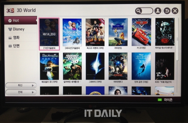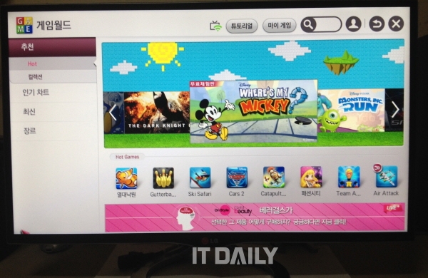 또 LG 시네마 3D 스마트 소형 TV는 LG가 제공하는 일반 TV에서는 볼 수 없는 다양한 콘텐츠를 활용할 수 있다. ‘3D 월드’에서는 최신 영화, 다큐멘터리 등 다양한 장르의 3D 영상을 감상할 수 있고, ‘게임 월드’를 이용해 다양한 게임을 TV에서 즐길 수 있다.